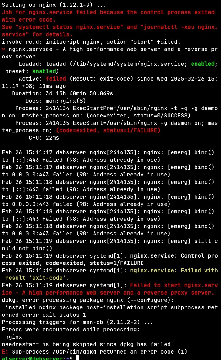Hello, I’ve been messing around with prosody and snikket and that means I’ve been messing around with nginx. I was having some issues so I decided to uninstall nginx and after anothet round of messing around with snikket, decided to install nginx again. It showed this error and I don’t really know what to do, since I’m really not that good with self-hosting yet. Please help. I will give more info as needed.