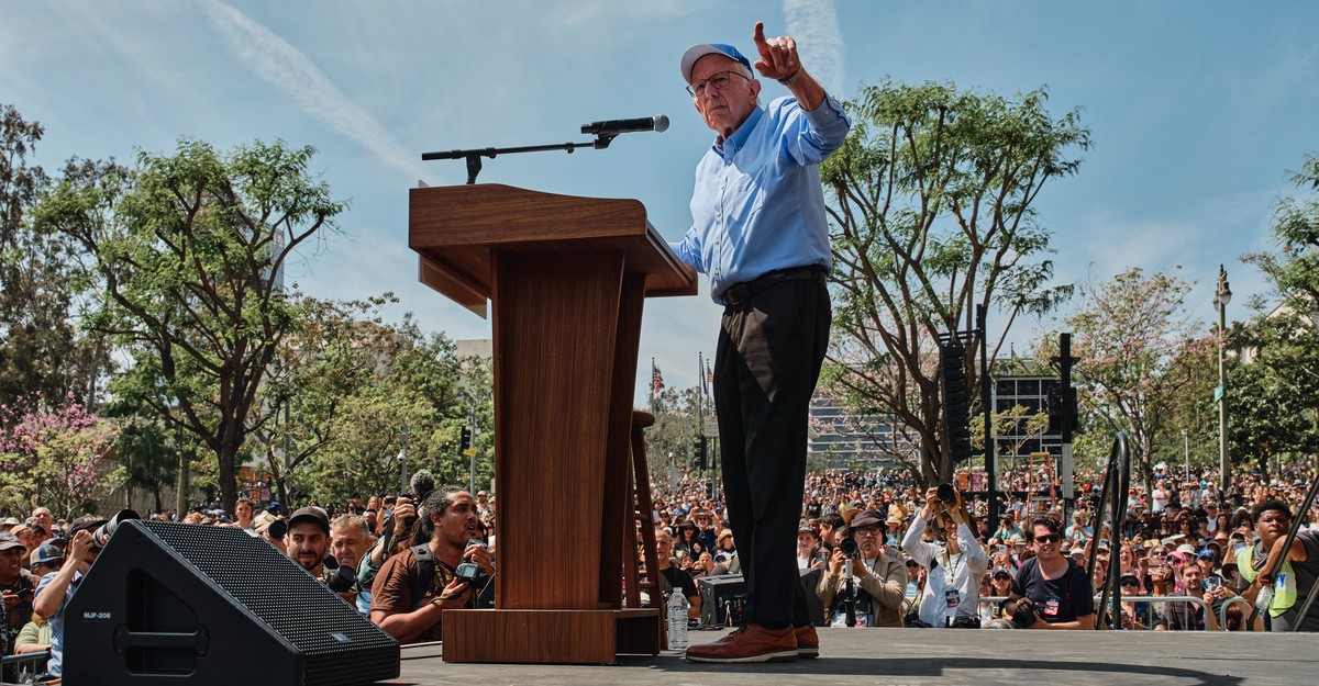 Countless 2024 postmortems have argued that Democrats lost voters to Trumpism because they’ve become the party of elites that has lost touch with regular Americans who feel they have little stake in the system. Perhaps Sanders, an independent who caucuses with Democrats, connects with grassroots supporters because they trust that he really believes what he’s saying; his talking points do not come from a focus group. But he’s also, more simply, one of the few leaders who is filling the void of opposition. “Your presence here today is making Donald Trump and Elon Musk very nervous,” Sanders told the crowd. He scoffed at the image of the three wealthiest Americans—Musk, Jeff Bezos, and Mark Zuckerberg—assembled behind the president at his January inauguration. Those three tech titans, Sanders reminded everyone, have more wealth than the bottom half of society, some 170 million people, combined.