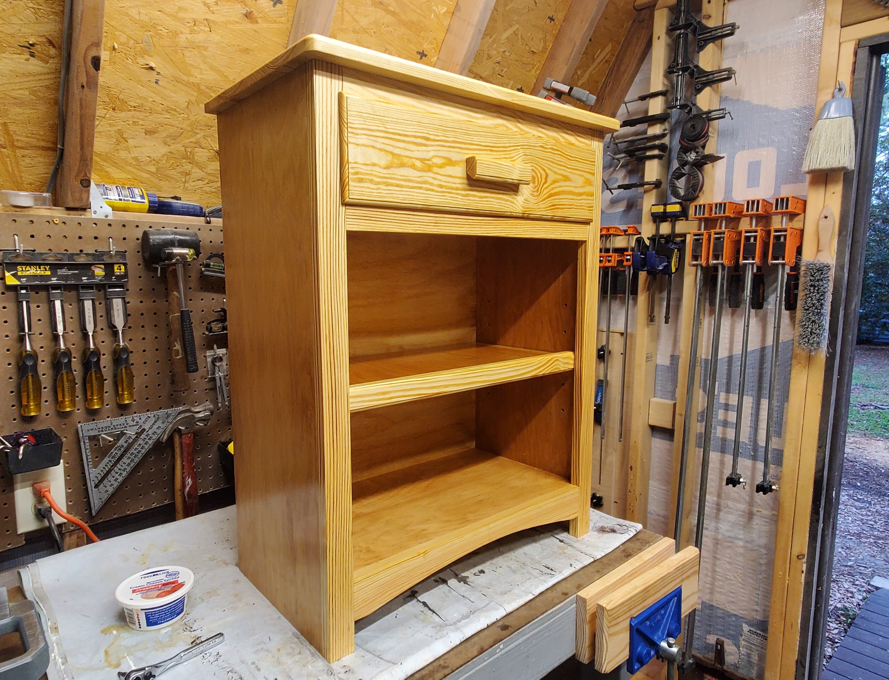 It’s a little scratch and dent given it’s made out of offcuts, scraps and extras from other projects but I think it came out okay. Three coats of fake “tung oil” finish and it came up to a nice warm semi-gloss, and ambered up the pine enough to take the edge off the grain.
