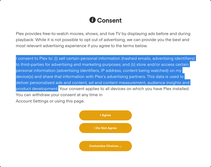 I consent to Plex to: (i) sell certain personal information (hashed emails, advertising identifiers) to third-parties for advertising and marketing purposes; and (ii) store and/or access certain personal information (advertising identifiers, IP address, content being watched) on my device(s) and share that information with Plex’s advertising partners. This data is used to deliver personalised ads and content, ad and content measurement, audience insights and product development. Your consent applies to all devices on which you have Plex installed. You can withdraw your consent at any time in Account Settings or using this page.