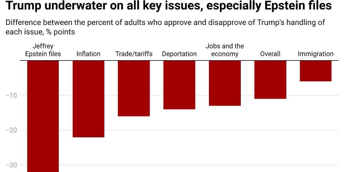 In the background of all this, polls show Trump’s position plummeting. For this week’s Chart of the Week, let’s take a quick look at Trump’s approval overall, and on tariffs, deportations, and Epstein. The size of the hole he is in on the Epstein case is maybe the worst number I’ve ever seen for a president.