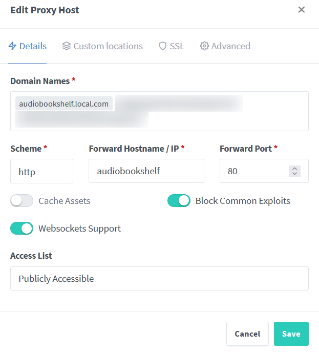 Then I set up Nginx Proxy Manager following the guide from Audiobookshelf by adding a proxy host. Trying to resolve audiobookshelf.local.com to I simply followed the guide and wasn’t sure why the “Forward Hostname / IP” should be the container name audiobookshelf.
