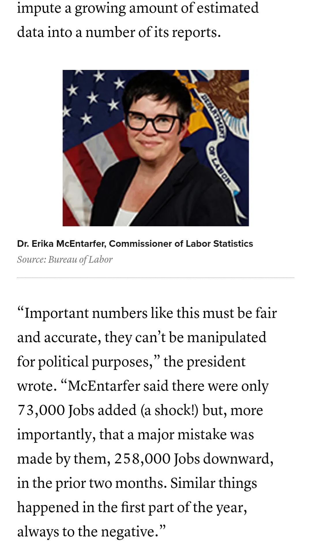 Okay, I just posted his quote from the Bloomberg article to make fun of it. But I have to say that I am very disappointed in CNBC for not including the last sentence. “Important numbers like this must be fair and accurate, they can’t be manipulated for political purposes.”Are they trying to make him look reasonable here by not including the blatantly hypocritical last sentence?He is accusing this woman of altering the job numbers without any evidence at all while absolutely everyone who has their head even partway out of their own ass knows that any appointee he chooses will be cooking the books for him from day one.Edit: I reacted too quickly, It is included in the article. It’s just further down.