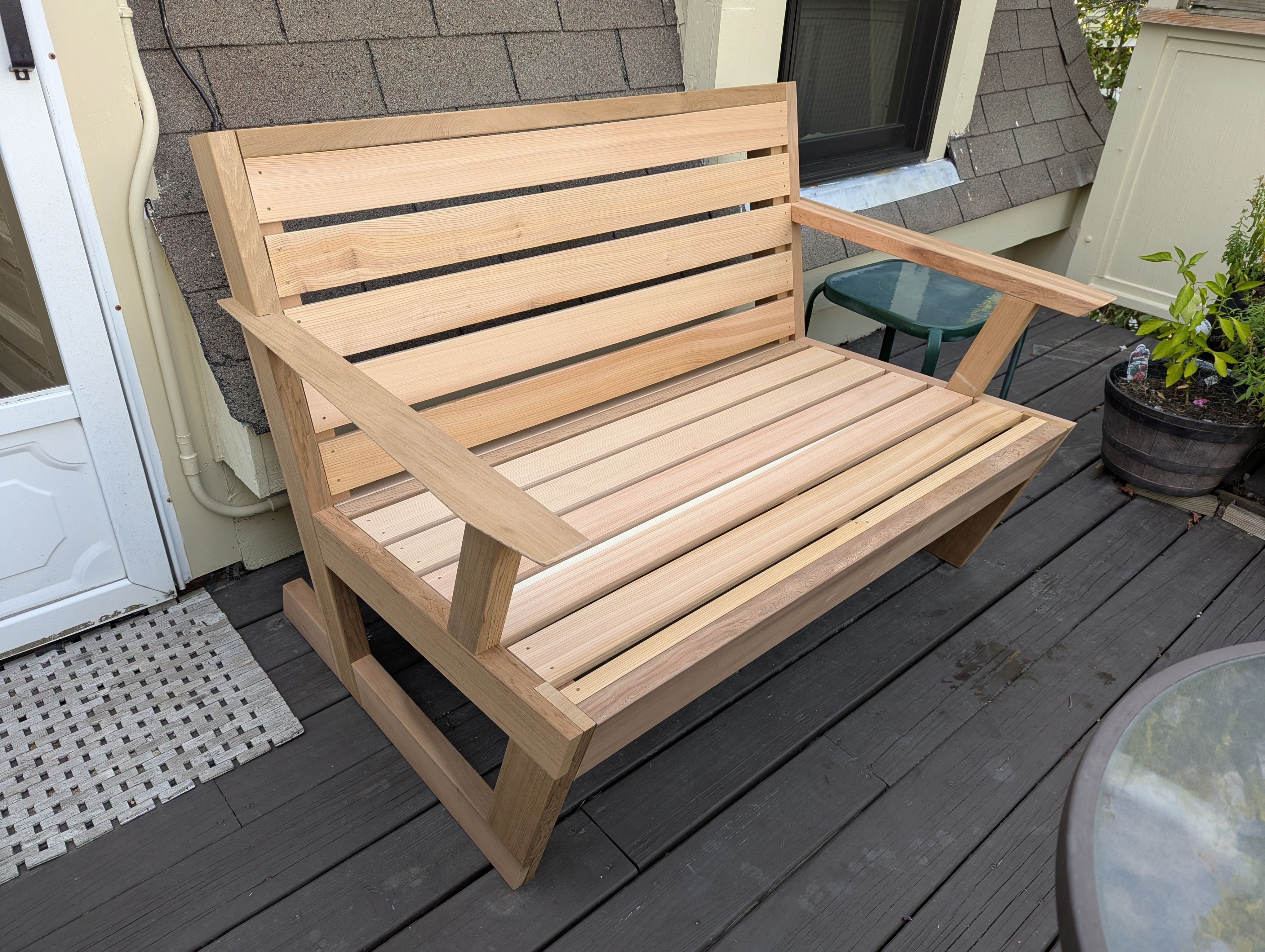 I used western red cedar for rot resistance, since this will sit unsheltered. I haven’t finished it yet, I’m considering poly, boiled linseed, or Thompson’s water seal (glad for recommendations). First time working with cedar, it’s very soft and scratch prone, smells great, and is noticeably lighter than pine. Also pricey; one thing I didn’t like about this design is it is fairly overbuilt.