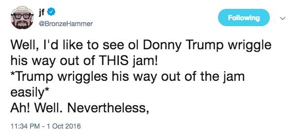 And every time it’s like, “We’ve got the ‘grab them by the pussy’ tape! Surely this will be it.” Then they get back to their own time and nothing has changed.