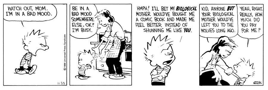 Aw, that sucks. I think it’s clear he meant this not as a commentary on the difference between biological and adoptive parents but just a joke on how difficult of a kid Calvin is.