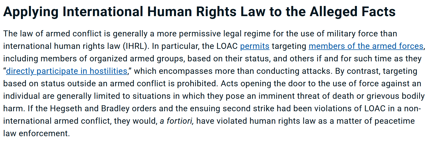 The Sept. 2 strikes on the purported drug boat neither violated the law of armed conflict nor amounted to war crimes, because they did not occur during an armed conflict. However, if the facts are as reported, there is little question that the order by Secretary Hegseth and the ensuing order by Admiral Bradley to conduct the second strike were unlawful, because the killing of the two survivors was a serious violation of international human rights law.