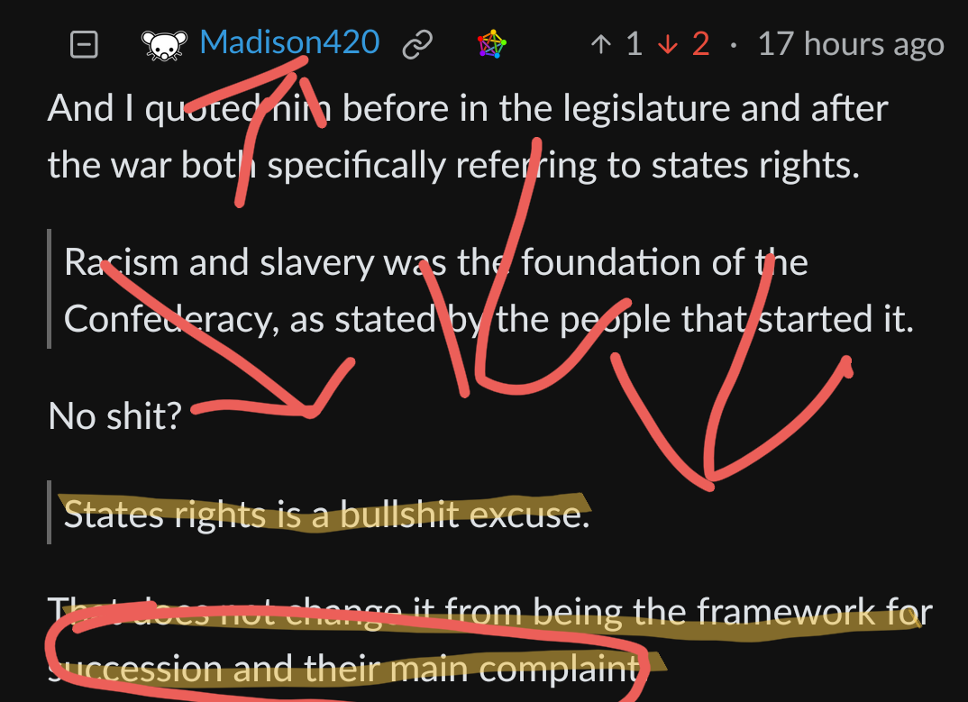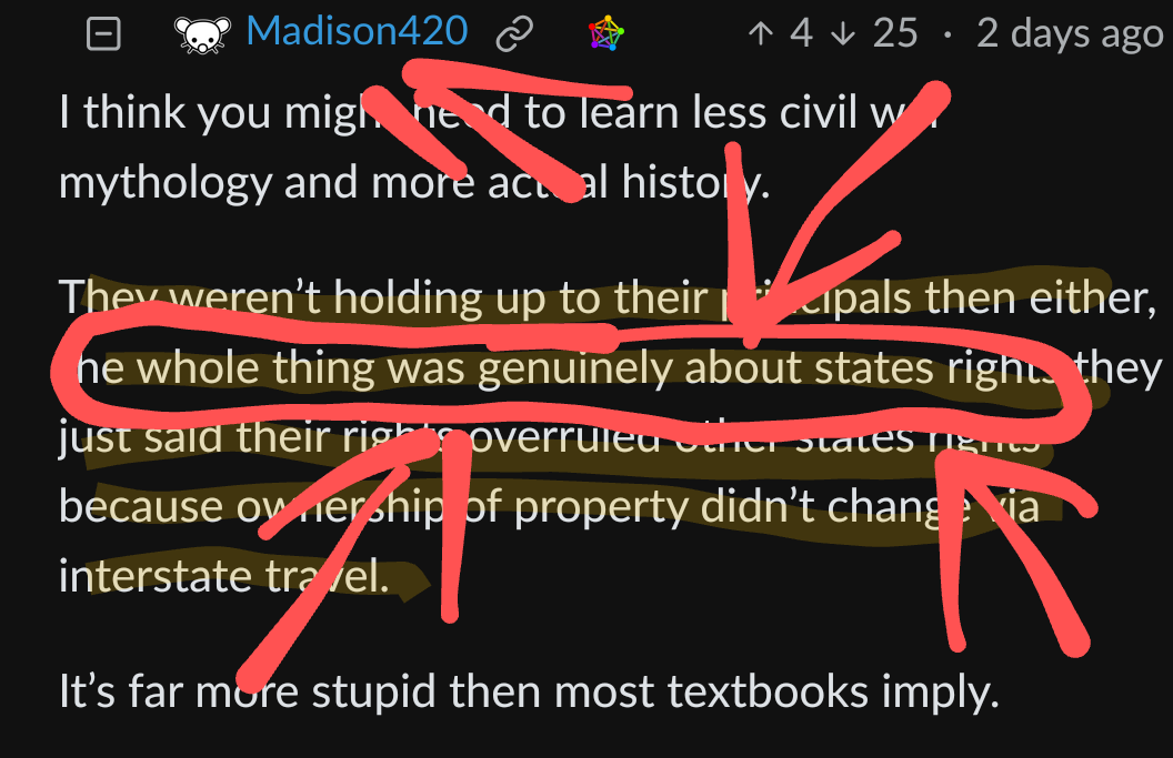 Exactly. The slave states didn’t care about states rights at all. All they cared about was keeping slaves. If the believed in what they were saying about states rights, they wouldn’t have tried to force non-slave states to turn over freed slaves. The entire “confederates wanted states rights” argument is bullshit. They used the states right excuse to uphold the practice of slavery, and completely ignored these rights when they were used against slavery.
