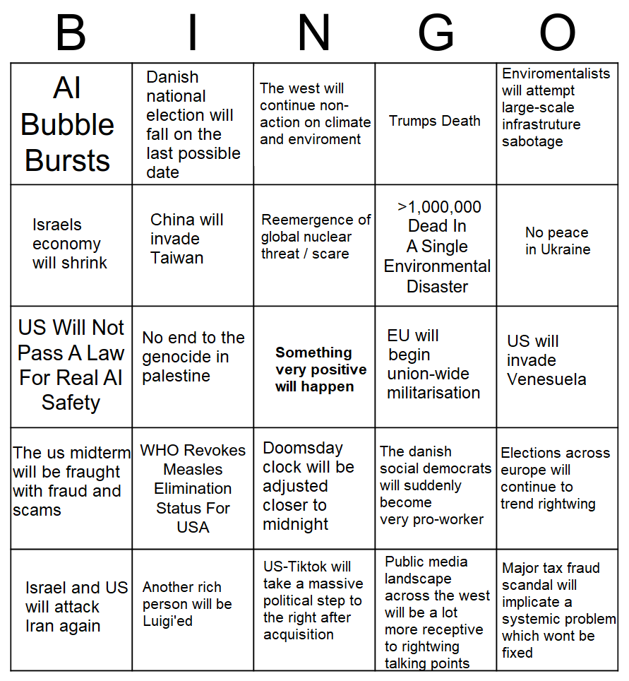 I recently saw someone creating a bingo chart for 2025 so I decided to create one for 2026 (image of this post). What are your predictions for 2026?