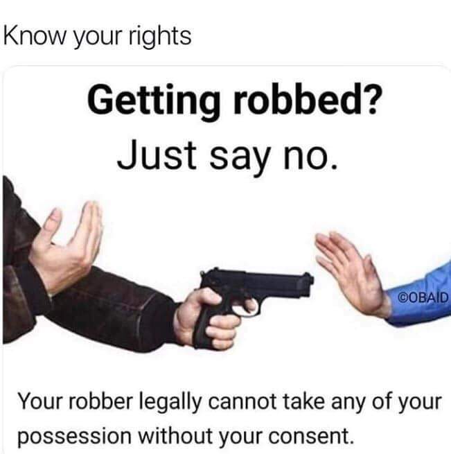 The meme is saying that if you’re being robbed, you need to fight, they aren’t going to stop because it’s illegal. My understanding of the meme is it’s mocking the idea that following the rules will protect you from corrupt police. Your rights won’t protect you