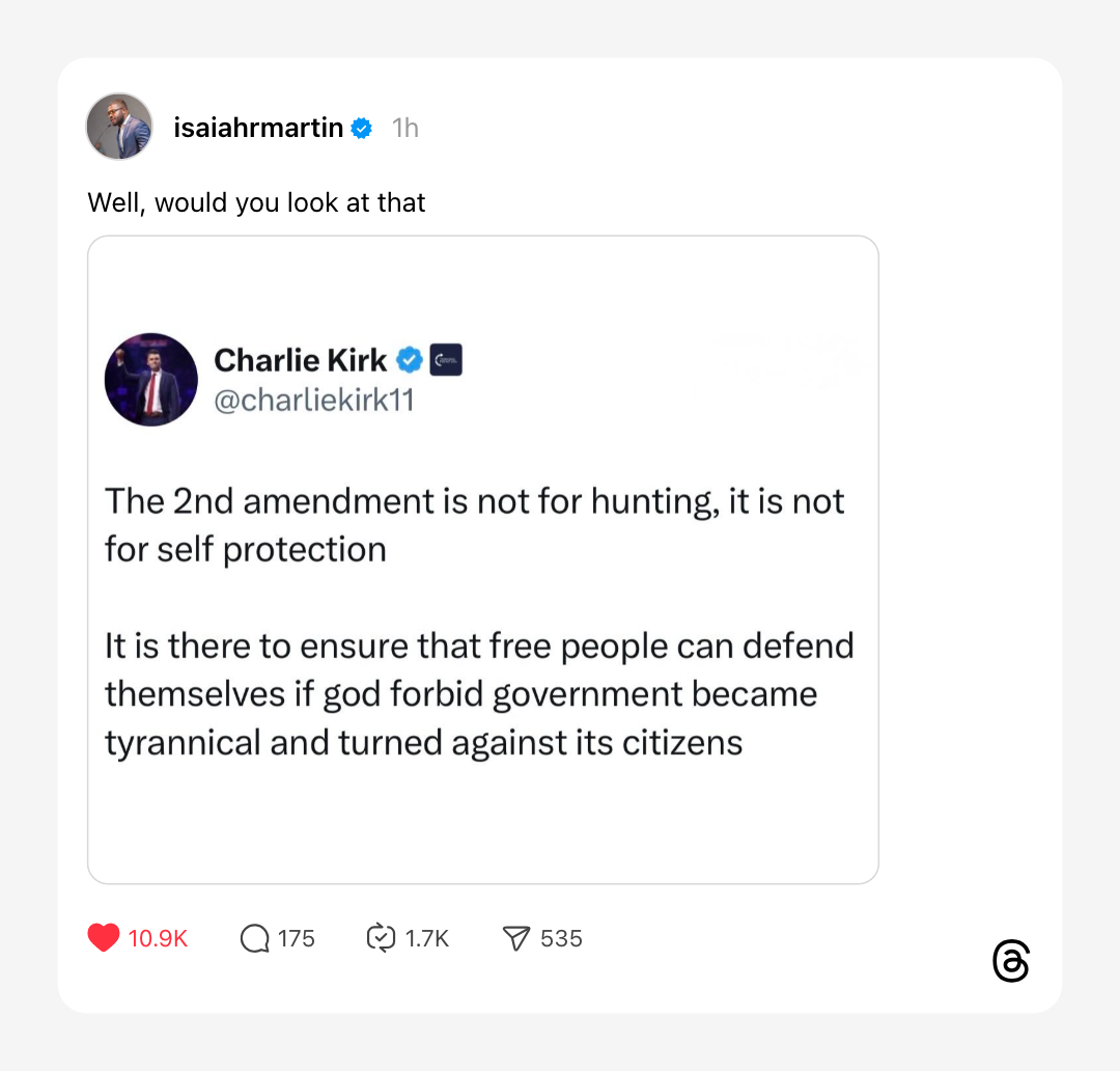 I mean, it’s Charlie Kirk, but still, what a stupid thing to put in the Constitution if it’s for that reason. What about a plebiscite to kick out some rogue government? Nah, let’s give guns to the people so they can make a Civil War whenever they feel like it.