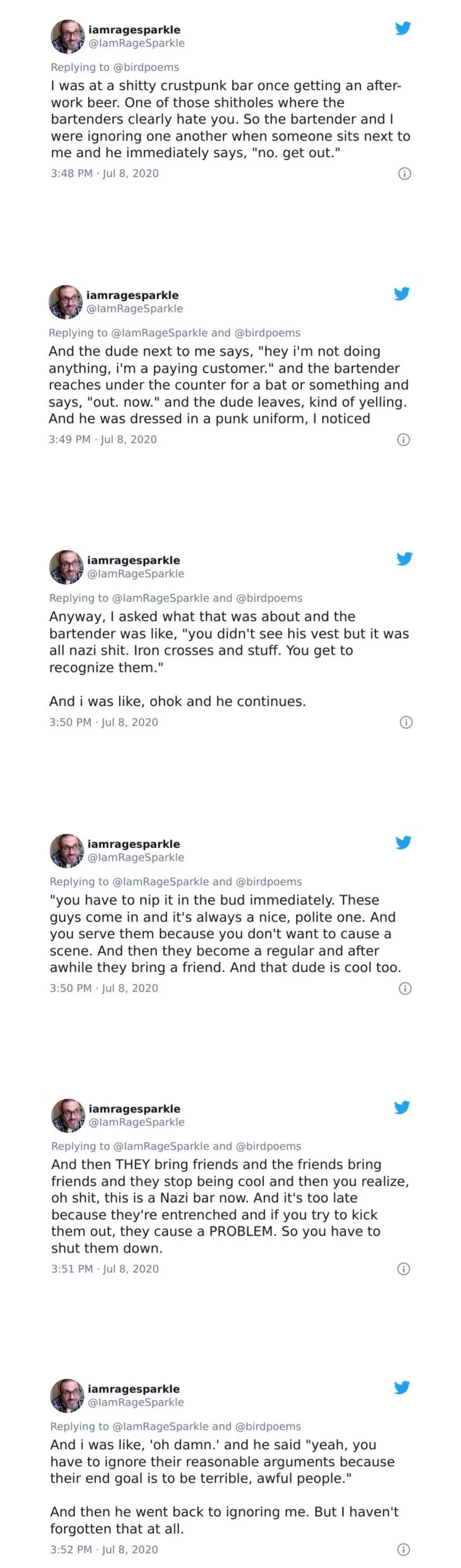 Anecdotal story and all but I feel this encapsulates why most people support kicking Nazis out even if they seem polite to start.