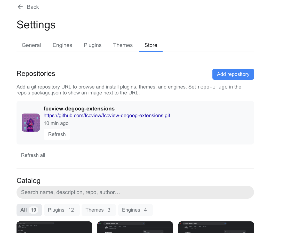 Official extensions: https://github.com/fccview/fccview-degoog-extensions