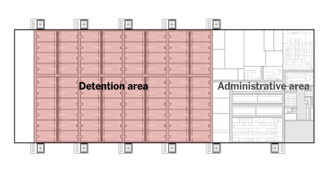 The floor plan shows only a single path for 8,500 detainees and hundreds of staff to evacuate in an emergency like a fire. While the warehouse has at least 30 more doors that the floor plan does not appear to account for, even those may not be enough for egress.